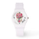 Relógio moderno de pulso redondo com pulseira de silicone branca e números primários elegantes. A face apresenta um design encantador de uma casa de bule de chá de conto de fadas repleta de belas rosas cor-de-rosa e pedaços de folhas verdes. O bule de chá é adornado com grandes pontos verdes, uma porta rosa brilhante e uma alça e bico dourados brilhantes. As iniciais elegantes do monograma preto podem ser facilmente alteradas ou removidas. Este design é compatível com os relógios de silicone preto e transparente. Também estão disponíveis uma jaqueta de jeans, uma bolsa grande e camisetas básicas e plus size combinando.