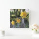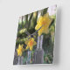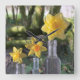 Três daffodilos amarelos e laranja brilhantes de várias espécies são mantidos em três frascos britânicos antigos, com uma antiga estrada romana, a Fosse Way, como pano de fundo.