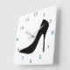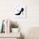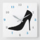 Um relógio preto e branco clássico com números e uma ilustração digital de um calçado preto de salto alto. Disponível em outras opções. Visite nossa Loja para mais blocos e outros acessórios para na moda.