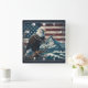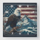 Uma águia majestosa fica em um galho, ignorando uma paisagem rochosa com montanhas e ondas, todas colocadas em um pano de fundo da bandeira americana.