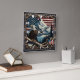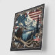 Uma águia está orgulhosa num galho, ignorando uma visão cênica de montanhas e lagos, com a bandeira americana sutilmente tecida no pano de fundo.