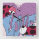 Dois insetos de amor olhando um para o outro como um senta-se na letra L da palavra, AMOR. Enquanto o outro inseto de amor fica em frente a um coração roxo feito de um platter de tinta.