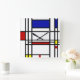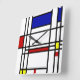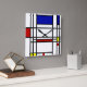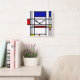 O relógio da parede da Arte Moderna Mondrian tem uma seção como Composição 10 de Pieter Piet Mondrian em vermelho, azul, amarelo, preto e branco, a mais conhecida do grupo de arte De Stijl que usou três cores primárias com linhas pretas em um fundo branco