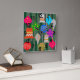 Este relógio de parede tem um design que se parece com ornamentos em vermelho, verde, azul, rosa, ouro, prata e branco em uma árvore de Natal.