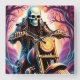 um esqueleto preso na bicicleta do pandemônio. Andando pelos galhos entrelaçados na trilha. Ele tinha um salto. Ele tem uma calça preta de couro e botas de motocicleta e uma jaqueta de couro preto com osso como um design na roupa de bilker. Com o sol descendo atrás dele. Haze ascensão do seu redor para a noite escura que ele se deita com estrelas noturnas acima.
