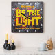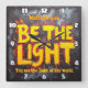 This image presents a powerful and dramatic artwork featuring the phrase "BE THE LIGHT" in bold, textured yellow and orange lettering, appearing as if it's glowing or on fire. The background is a dark, heavily textured, and painterly mix of grays and blacks, creating a stark contrast that emphasizes the fiery text. At the top, "Matthew 5:14" is written in yellow, and at the bottom, "You are the light of the world" is inscribed in a similar yellow script. The overall impression is one of intense spiritual inspiration and warmth, resembling a modern abstract painting with a significant message.