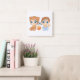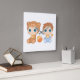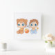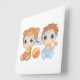 Bebês bonitos de desenho animado em rompers. A da esquerda está vestida com um macacão de urso marrom com uma bib amarela com uma pequena abelha. A da direita está vestida com um pano azul com uma bib amarela e segurando um bebê chocalho. A bola brilhante está descansando entre eles.