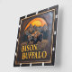 Esta trabalho de arte mostra um bisão magnífico em um campo com uma montanha torrencial atrás dela. A ilustração é enquadrada por uma borda de couro. A peça inteira tem uma sensação dramática, rústica, e inclui o texto "BISON, BUFFALO" no fundo.
