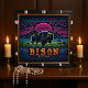 Esta ilustração apresenta um fundo de couro néon colorido, escuro e com um forte bisão em um campo. Uma cordilheira é visível atrás dela, sob um pôr do sol estilizado de neon, com matizes roxos e rosa vibrantes. O texto "BISON BUFFALO" aparece de forma destacada na parte inferior, em caracteres brilhantes, no estilo ocidental.