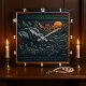 Esta ilustração retrata um bisão estilizado com uma textura robusta e trabalhada, em pé numa paisagem de montanhas e árvores. Uma lua grande e brilhante ou sol é visível no horizonte, lançando uma luz laranja quente sobre a cena. O resto do trabalho de arte é renderizado em tons legal azuis e verdes, criando um belo contraste. Toda a imagem tem um olhar profundo, gravado, da folhagem detalhada à textura do próprio bisão.