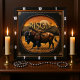Uma ilustração estilizada de um búfalo em seu hábitat natural, colocada contra um incrível pano de fundo da montanha. A peça tem uma textura de couro distinta e uma paleta de cores quentes e brilhantes. A poderosa silhueta do animal domina o primeiro plano, enquanto o texto "BISON" acrescenta ao design.