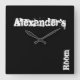 Este relógio de parede projetado a preto pode ser personalizado com qualquer nome.