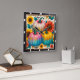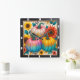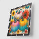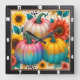 Este vibrante relógio de parede quadrada mostra três abóboras brancas, cada uma adornada com bolinhas coloridas e matizes cor-de-rosa, roxo, azul e amarelo. Cercado por girassóis brilhantes e milho doce, colocado sobre um fundo de impressão leopardo vivo, este relógio traz um toque lúdico e festivo de outono para qualquer espaço.