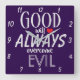Este é um belo relógio roxo em forma quadrada com uma mensagem poderosa. Diz: "BOM SEMPRE superará a MAU" em letras grandes brancas ao lado de um coração vermelho. Um lembrete excelente de que BOM sempre ganha!