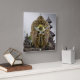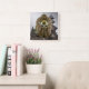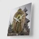 Relógio de parede acrílica de 10,75 pol. x 10,75 pol. com uma imagem de uma máscara buda marrom e dourada em uma imagem de fundo de um dia de cinza e de um templo balinês. As larvas de prata marcam as 12, 3, 6 e 9 posições. Veja a coleção inteira do Relógio Iluminado no DÉCOR | Seção Relógios.