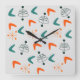 Este relógio de parede tem um design atômico moderno do século médio de formas de bumerangue, antenas e estereótipos em cor de laranja.