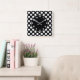 relógio de parede quadrada, com padrão de bolinhas preto e branco