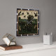 Este relógio de parede rústico apresenta um labrador negro fiel, Labrador Retriever, sentado pacientemente em lagoas altas. Patos voam ao fundo e natações solitárias de pato na água, com um pequeno barco por perto, capturando uma cena de caça de pato sereno.