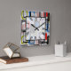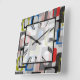 10,75" x relógio de parede de acrílico quadrado de 10,75" com uma imagem divertida no estilo de 50 de quadros com tiras azuis, verdes, pretas e cinzas, retângulos com faixas vermelhas, retângulos de xadrez pretos, retângulos vermelhos e brancos e quadrados de cinza na cinza. O relógio numérico romano fácil de ler fica em quadrado branco transparente com borda preta. Veja a coleção inteira do Nifty 50 Clock no DÉCOR| Seção Relógios.