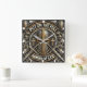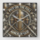 Este relógio de parede quadrado apresenta um escudo decorativo com um capacete cavaleiro no seu núcleo, flanqueado por espadas cruzadas, todas feitas com um acabamento metálico. A proeminente escritura "PUT ON THE CHEIO ARMOR OF DEUS" é exibida, cercada por design ornamentado e sotaques de ouro, servindo como um poderoso tema cristão e um lembrete fiel para a decoração domiciliar.