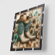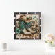 Este relógio de na moda quadrado apresenta um par de botas de cowboy ornamentado, um chapéu clássico de cowboy, e uma dispersão de creme e flores bronzeadas, todas descansando em uma superfície com padrão de cobalto. O design rústico mas elegante traz um toque de charme ocidental e beleza floral para qualquer espaço.