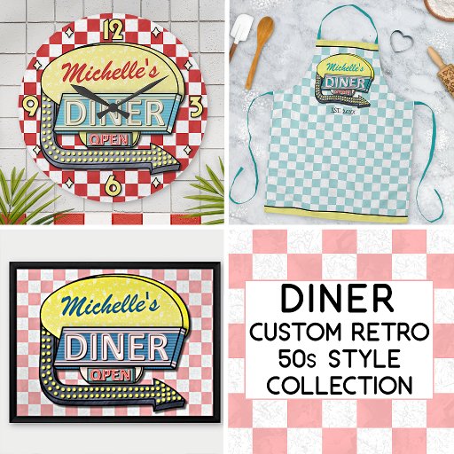 Crie o seu próprio relógio de sinal de restaurante, estilo 1950, usando este modelo fácil. Estes relógios retrorreflectores legal têm um fundo ligeiramente aflitos, cor-de-rosa-e-branco, com um sinal no topo que diz "DINER" e "OPEN" em neon com espaço para você adicionar seu próprio primeiro ou sobrenome - ou qualquer outra palavra que você queira. O sinal também tem um gráfico de seta aceso. Está tudo impresso em tons de rosa, branco, preto, azul, amarelo, cinza e vermelho. Basta preencher o modelo de DIY fácil ou "Personalizar" se o seu texto for longo e você precisar redimensionar, reorganizar ou alterar as cores e fontes do texto. Este relógio é perfeito para o seu restaurante, cozinha doméstica, bar tema de 50 ou festa de anos 50.