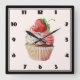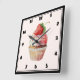 Um relógio com uma ilustração brilhante com um cupcake delicioso. Sorvete branco e um morango grande adoram este doce doce doce.