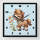 Um relógio com uma ilustração adorável. Um pequeno pônei marrom comendo margaridas felizes.