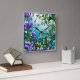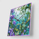 Um design vibrante com flores roxas entrelaçadas com um verde-luxuoso contra um fundo azul misturado, apresentando padrões florais vívidos e elementos naturais.