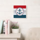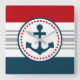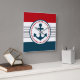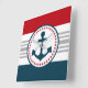 design náutico com decoração em forma de âncora, em forma redonda, sobre fundo azul, vermelho, cinza e branco listrado