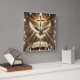 Este poderoso relógio de parede quadrado apresenta um crucifixo brilhante com uma pomba majestosa branca voando diretamente abaixo, simbolizando o Espírito Santo. Uma Bíblia aberta repousa reverentemente sobre uma superfície de pedra, rodeada por raios de luz radiantes e nuvens de tempestades dramáticas, criando uma profunda e inspiradora cena religiosa.