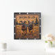 This lively square wall clock features a dimensional illustration of two reddish-brown dogs running excitedly toward the viewer through a grassy field. The entire design is rendered in rich brown, orange, and dark green tones, strongly suggesting a deep carved relief or Engraved Wood Look. The dogs are highly detailed, showing texture in their fur, and have happy, open-mouthed expressions. They are surrounded by long, textured brown grass and small reddish flowers. The background shows stylized pine trees and a low mountain ridge. The small, three-dimensional embossed text "Besties for Life" is carved across the top. The clock face features a simple clock face border with large, white, numbered tick marks (1 to 12) integrated into the outer frame. The artwork is surrounded by a thick, dark brown decorative border that resembles a black wood frame.
