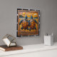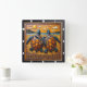 This appealing square wall clock features a highly dimensional illustration of two sea turtles side-by-side. The entire design is rendered in bright orange, blue, and tan tones, strongly suggesting a carved relief or Engraved Wood Look. The turtles have blue heads/flippers and highly detailed, textured orange shells, and are positioned on a textured sandy shore. The background shows a blue ocean, a sunset sky with clouds, and distant green hills. The large, three-dimensional embossed text "BESTIES FOR LIFE" is carved across the bottom. The clock face features a simple clock face border with large, white, numbered tick marks (1 to 12) integrated into the frame. The artwork is surrounded by a dark, textured decorative border that resembles a black wood frame.