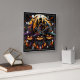 Três espantalhos coloridos com cabeças de abóbora brilhantes exibem teatralmente charme estranho, colocados contra uma silhueta de castelo assombrada e uma lua de cheio.