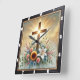 Este impressionante relógio de parede quadrada apresenta uma cruz de madeira brilhante, emitindo raios de luz divina contra um céu radiante. A base é enfeitada com uma enxurrada de flores vibrantes, incluindo um lírio branco proeminente, girassol e várias flores cor-de-rosa e azul, simbolizando fé, esperança e beleza natural.