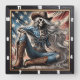 Representação insípida de um esqueleto vestido com um vibrante traje ocidental, com uma camisa de xadrez, botas e um chapéu, sentada contundentemente contra o pano de fundo da bandeira da Americana, simbolizando temas de liberdade e individualidade.