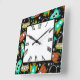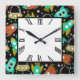 relógio quadrado de parede de acrílico x 10,75 pol. x 10,75 pol. com uma imagem divertida de artesanato retrorreflector turquesa, laranja e amarelo em preto com estrelas brancas, e um relógio numérico romano em um quadrado branco com uma borda preta. Veja toda a coleção Nifty 50 Clock no DECOR | Seção Relógios. Este produto não está associado nem afiliado ao titular original dos direitos de autor.