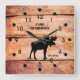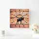 Personalize este design de relógio de aparência rústica com seu próprio texto. O relógio de parede acrílico é impresso em um padrão de estilo de prancha de olhar de cedro acentuado com um alce preto silencioso. Ajustado especialmente excelente em qualquer cabine de montanha, alojamento de campos de caça ou decor de caverna humana. Disponível em sua escolha ou rostos redondos ou quadrados.