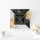 A moderna tomada de uma Arte Deco inspirou um relógio de parede, feito em um padrão geométrico de folha de cor dourada, mármore branco e mármore preto. Um quadrado preto e dourado, no meio, tem um monograma de letras solteiros amarelas ouros e texto branco pronto para personalizar. Adorável decoração doméstica e faz uma ideia de presente de excelente.