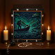 Esta é uma ilustração estilizada representando um aventureiro solitário em um barco estreito, descendo por um rio da selva. O trabalho de arte é renderizado em tons de azul profundo e barro vibrante, dando-lhe uma sensação mística e noturna. Folhagem tropical exuberante, montanhas distantes e uma ave aérea são todas representadas com textura gravada ou semelhante a madeira. Vários peixes são visíveis na água brilhante perto do barco.