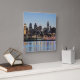 Esta é a lindíssima linha do horizonte da cidade de Filadélfia, tirada ao pôr do sol do outro lado do rio Delaware, na margem de Camden. A arquitetura dos arranha-céus de Filadélfia está exposta nesta foto. Center City, a área centro de Filadélfia, é o foco desta fotografia. As luzes da cidade lançam reflexões coloridas sobre a água.
