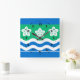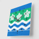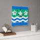 Wall Clock with design with a flag of historic county of Cumberland, in England, Great Britain; green flag with three Parnassus flowers and white and blue waves