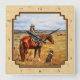 Uma jovem cowgirl espera que seu pai se recupere para que comecem a arredondá-lo. Tudo num fundo de padrão amarelo pálido.