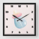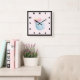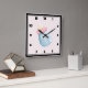 Um relógio com uma imagem fofa de uma garrafa de bebê azul-claro com uma jante rosa.