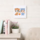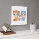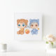 Bebês bonitos de desenho animado em rombos de animais. A da esquerda está vestida com um macacão de urso marrom com uma bib amarela com uma pequena abelha. O da direita está vestido como um gato cinza e segurando um chocalho em forma de um sino de gato. A bola brilhante está descansando entre eles.