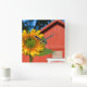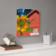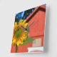 Um girassol se posiciona contra o pano de fundo de um celeiro vermelho com uma bandeira americana. O girassol (Helianthus annuus) é uma planta nativa anual das Américas. O girassol é a flor do estado do Kansas. Na parte de trás do cartão, uma abelha de mel visita um girassol. As abelhas são polinizadores importantes.