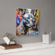 Um pitbull digital colorido de arte aérea cercado por arte de rua de grafite em um ambiente urbano.
