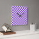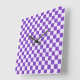 A purple and white checkerboard pattern with alternating squares, creating a balanced design. The vibrant colors give a playful, energetic feel.