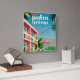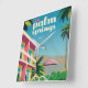 Ilustração do estilo Vintage Art Deco com um hotel rosa e laranja com piscina de natação contra um céu azul brilhante com palmeiras