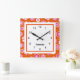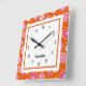 Este padrão de energia floral colorido vem em um relógio de parede quadrada e está pronto para seu nome pessoal. O impressão de flores folk estilo 60 repetido é criado em uma paleta brilhante de rosa-quente, branco e vermelho-alaranjado com um sotaque de fundo branco, pronto para editar o texto com o clique de um mouse. Bonito presente para uma sala de adolescentes ou adolescentes.